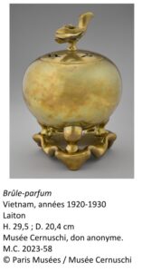Vous découvrirez de remarquables bronzes et brûle-parfums, où la virtuosité des artisans transforme la matière en formes végétales et décoratives. Entre tradition et modernité, ces œuvres témoignent aussi de l’influence de l’Art déco et de l’évolution des savoir-faire dans le contexte colonial.
