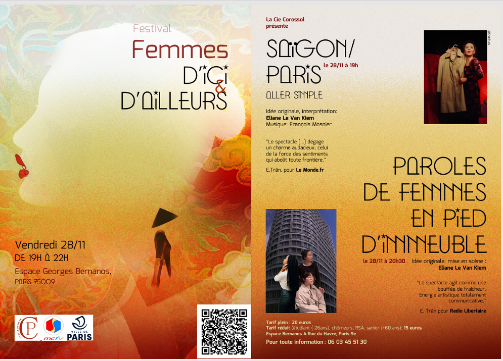 Vendredi 28 novembre 2025 de 19h à 22h, la Cie Corossol présente deux spectacles, « Saïgon/Paris Aller simple » (19h) et « Paroles de femmes en pied d’immeuble » (20h30) d’Eliane Lê Van Kiêm dans le cadre du Festival « Femmes d’ici et d’ailleurs », Espace Georges Bernanos (4 rue du Havre, Paris 9e) en partenariat avec le Cercle Premier, le MCFV et l’EDL (Equipe de Développement Local) du 13ème arrondissement de Paris.
