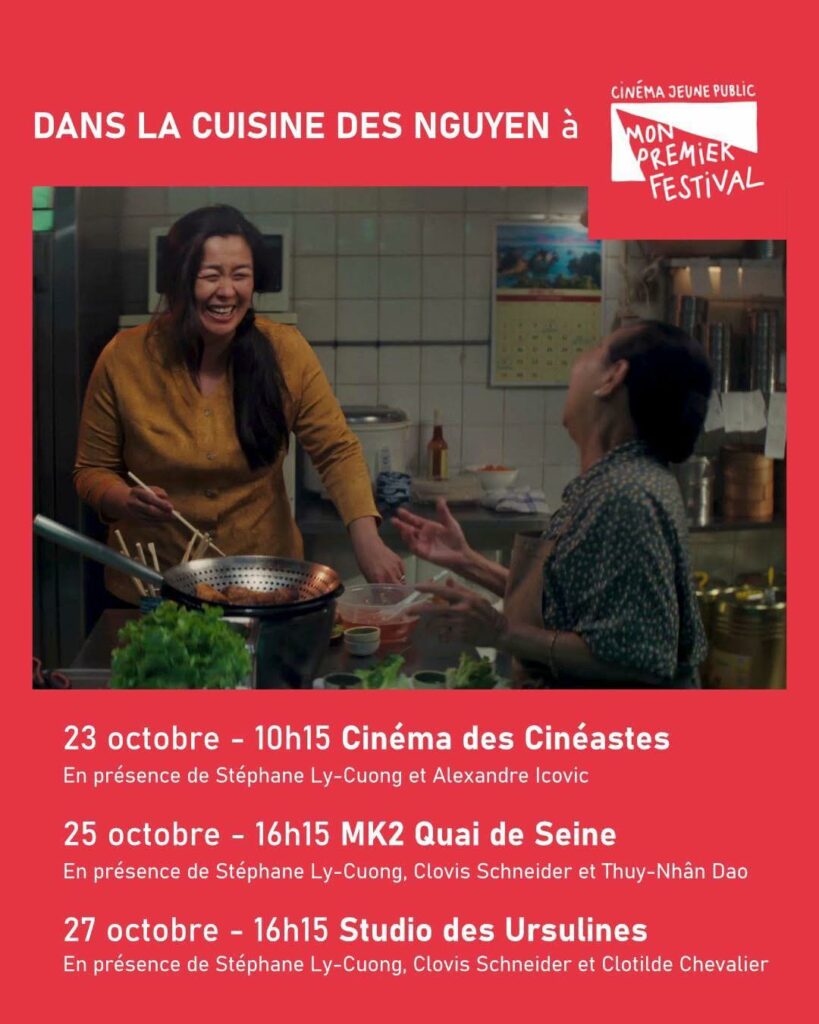 Lundi 27 octobre 2025 à 16h15 au Studio des Ursulines, 10 rue des Ursulines, Paris 5è, séance unique de projection en salle du long métrage (comédie musicale) « Dans la cuisine des Nguyen » de Stéphane Ly-Cuong en sa présence et en présence de l’actrice Clotilde Chevalier et du compositeur Clovis Schneider.
