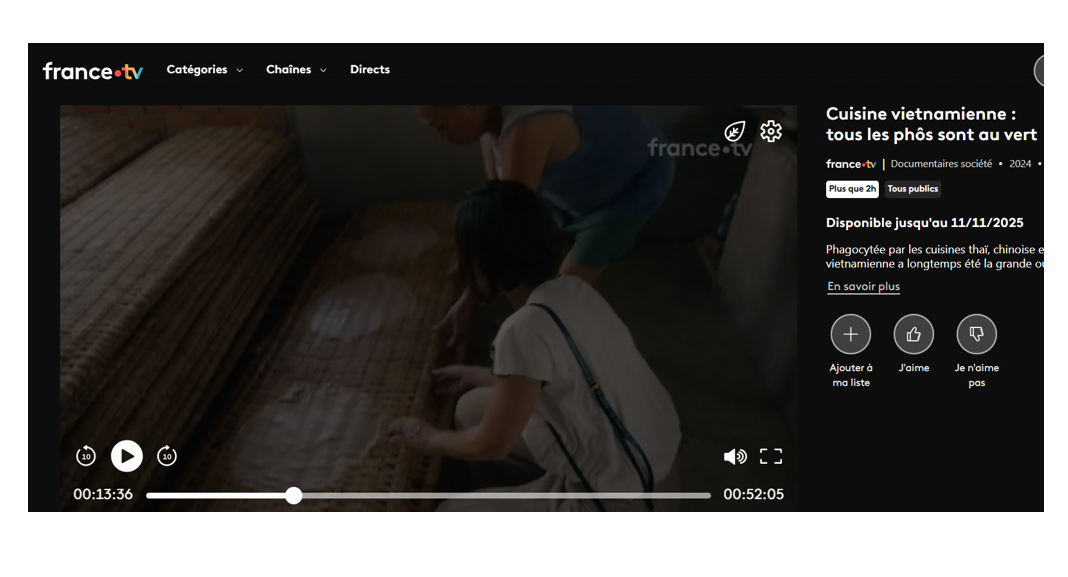 - En 2025, plusieurs documentaires sur la cuisine vietnamienne ont été diffusés sur ARTE TV et sont disponibles en replay jusqu’en 2028. Les liens d’accès à ces replays seront publiés plus tard sur le site internet du MCFV et ont déjà été publiés sur le Facebook du MCFV.