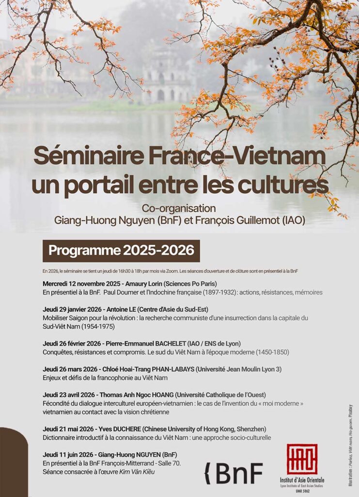 Le programme 2025-2026 est co-organisé par Giang-Huong Nguyen, BnF (Bibliothèque nationale de France), et François Guillemot, IAO (Institut d’Asie Orientale)